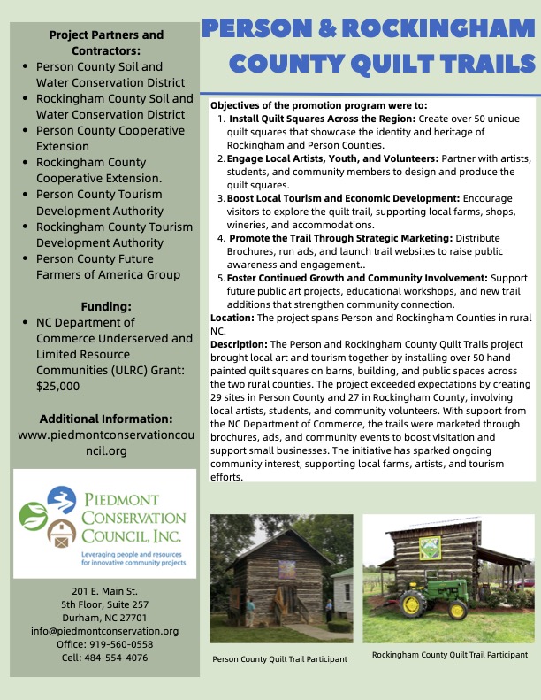What started as just an idea in 2015, became a reality with the help of PCC and the N.C. Department of Commerce. In combination with two other counties, Rockingham and Randolph, this quilt trail allows people to see what makes North Carolina unique. Each quilt reflects the area, the people and the businesses on which they reside and each have a unique story to tell. Patrons are encouraged to stop at the 40+ locations along the trail and learn about the history, stories and people behind them.